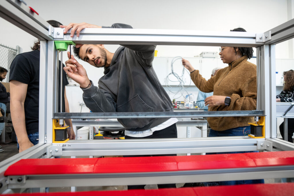 The Life Sciences and Engineering Building (LSEB) is a multidisciplinary academic facility at George Mason University that supports hands-on training in fields such as kinesiology, microbiology, chemistry, engineering, forensic science, robotics, and autonomous vehicles. Specialized instructional spaces include a wind tunnel lab, machine shop, robotics testing areas, advanced manufacturing labs, and a 3D print studio.
